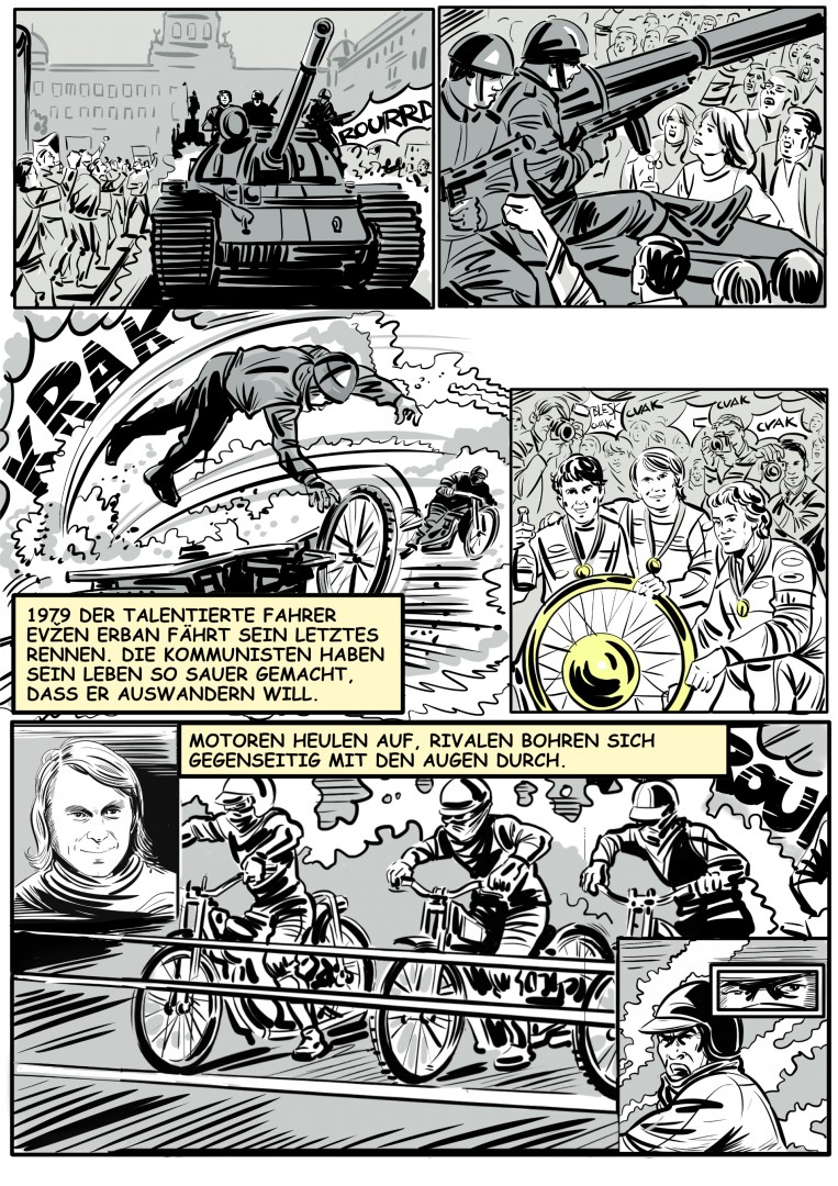 Wir haben uns sehr viel Mühe gegeben, die Speedwaybahnen zu besehen und mit vielen Fahrern, Funktionären und Fans zu reden. Jetzt versuchen wir, all diesen wunderbaren jugendlichen Enthusiasmus in ein Szenar umzuschmelzen, das so fesselnd wie möglich sein wird. Gleichzeitig erstellen wir ein Film-Storyboard in Form eines sehr durchgearbeiteten Comicbuchs, das wir im Rahmen der Filmpremiere veröffentlichen werden.
