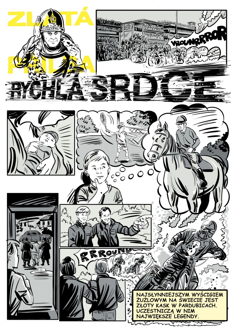 Skąd taka nazwa? Jeśli jesteś choć trochę fanem żużla, twoje tętno przyspieszy! A nawet jeśli widziałeś "platformę" tylko z pędzącego pociągu, będziesz znał niektórych bohaterów filmu, który właśnie przygotowywujemy. Wraz ze scenarzystą Otą Klempířem zainspirowaliśmy się niesamowitą historią życia zawodnika i prezesa ZŁOTEGO KASKU Pardubice EUGENIUSZA ERBANA, którą sprytnie połączyliśmy z historią żużla i losami największych motocyklowych mistrzów swoich czasów. Ale zacznijmy od początku…